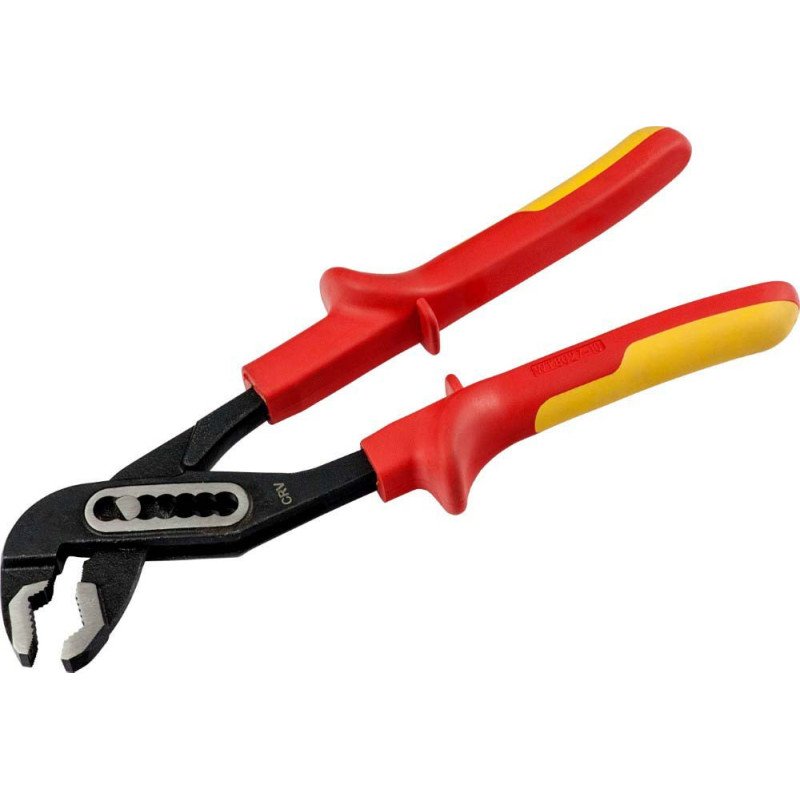 Profesionálne kliešte na rúry STALCO PERFECT (sikovky) VDE 1000V, dĺžka 250 mm. Navrhnuté pre bezpečnú prácu na potrubiach a armatúrach v prostredí s rizikom kontaktu so živými elektrickými obvodmi až do 1000 V (AC). Pevná konštrukcia z Cr-V ocele, 7-polohový nastaviteľný kĺb a certifikované VDE rukoväte zaručujú maximálny výkon a ochranu. Nekompromisná bezpečnosť a silný úchop pre špecializované montážne a údržbárske práce.