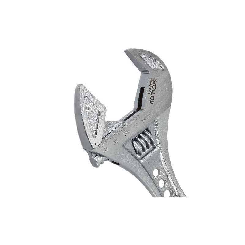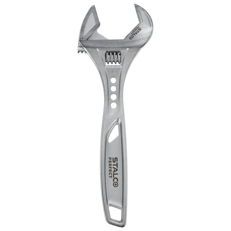 Profesionálny nastaviteľný kľúč STALCO PERFECT so širokými čeľusťami, dĺžka 250 mm. Tento univerzálny kľúč s dĺžkou 10 palcov (250 mm) disponuje veľkým rozsahom čeľustí až do 43 mm. Je vyrobený z vysoko pevnej chróm-vanádiovej (Cr-V) ocele. Precízny mechanizmus, laserom vypálená stupnica a ergonomická dvojkomponentná rukoväť z neho robia špičkový nástroj pre inštalatérov a mechanikov.