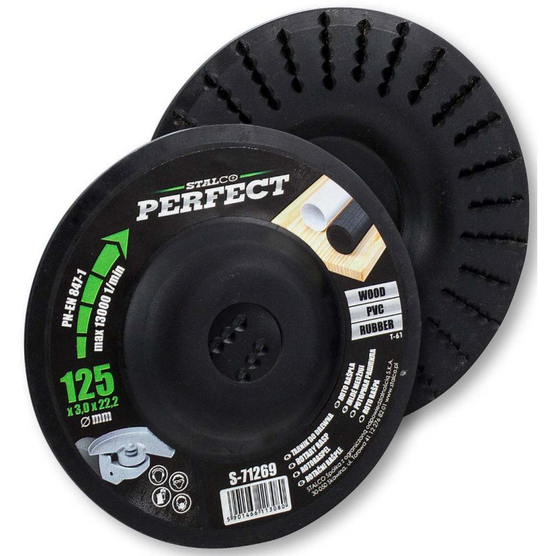 Agresívny plochý rašpľový kotúč STALCO PERFECT pre uhlové brúsky, Ø 125 mm. Navrhnutý na rýchle plošné brúsenie, uberanie a vyrovnávanie mäkkých materiálov ako je drevo, plasty a guma. Pracovná plocha s posypom z ostrých zŕn karbidu volfrámu pre maximálny výkon. Plochý profil so zapusteným stredom je ideálny na prácu na rovinách.