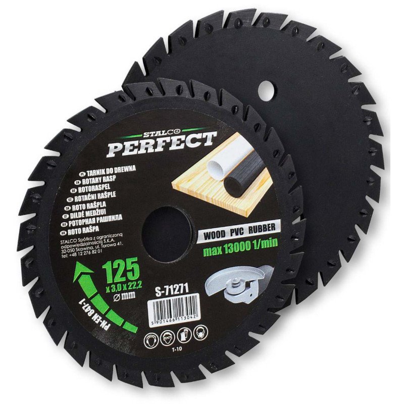 Extrémne výkonný pílový a rašpľový kotúč STALCO PERFECT (reťazový kotúč) s priemerom 125 mm. Navrhnutý na najagresívnejšie uberanie materiálu, rezanie, drážkovanie a tvarovanie dreva, plastov a gumy. Osadený zubami z tvrdokovu pre extrémny rezný výkon. Upozornenie: Nástroj určený výhradne pre skúsených používateľov. Vyžaduje dodržiavanie najvyšších bezpečnostných opatrení.