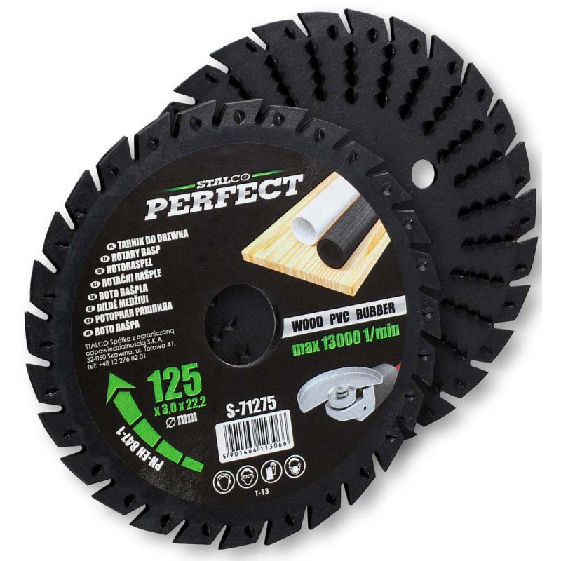 Extrémne výkonný pílový a rašpľový kotúč STALCO PERFECT (reťazový kotúč) s priemerom 125 mm. Navrhnutý na najagresívnejšie uberanie materiálu, rezanie, drážkovanie a tvarovanie dreva, plastov a gumy. Osadený zubami z tvrdokovu pre extrémny rezný výkon. Upozornenie: Nástroj určený výhradne pre skúsených používateľov. Vyžaduje dodržiavanie najvyšších bezpečnostných opatrení.