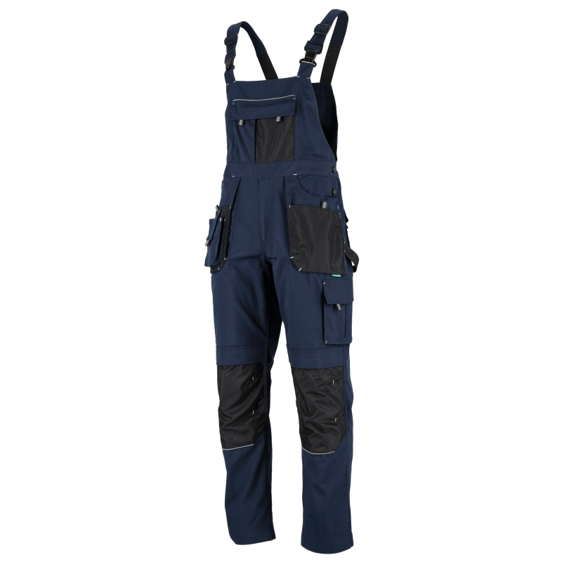 Odolné a funkčné pracovné nohavice s trakmi STALCO z rady BASIC LINE. Univerzálne montérky na každodenné použitie v stavebníctve, priemysle a pri montážnych prácach. Sú vyrobené z odolnej zmesi bavlny a polyesteru so zosilnením z extrémne pevnej tkaniny OXFORD 600D na kolenách, hrudi a vreckách. Trojité švy zaručujú maximálnu životnosť. Nohavice disponujú početnými multifunkčnými vreckami vrátane vreciek na nákolenníky, nastaviteľnými elastickými trakmi a reflexnými prvkami.