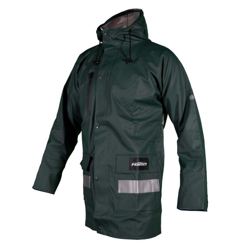 Vysoko odolná nepremokavá bunda STALCO PERFECT z modelovej rady Aqua J v zelenej farbe. Navrhnutá pre profesionálov pracujúcich v extrémnych poveternostných podmienkach. Poskytuje absolútnu ochranu pred silným dažďom a vetrom. Je vyrobená z osvedčeného materiálu PLAVITEX s plne podlepenými švami pre 100% vodotesnosť. Má vynikajúce termoizolačné vlastnosti a je odolná voči nízkym teplotám.
