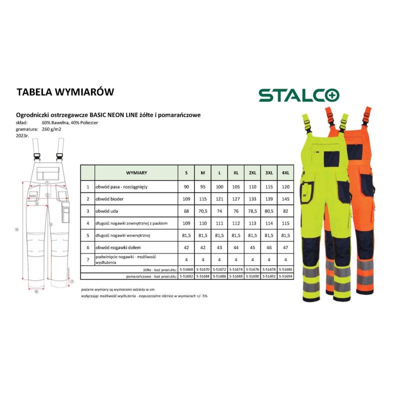 Vysoko viditeľné pracovné nohavice s trakmi STALCO z rady BASIC NEON LINE. Navrhnuté pre maximálnu bezpečnosť pri práci na cestách, stavbách a v iných rizikových oblastiach. Sú certifikované podľa normy EN ISO 20471 (trieda 2). Kombinujú neónovú tkaninu a široké 75 mm reflexné pásy. Odolné výstuhy z materiálu OXFORD 600D na kolenách a vreckách zaručujú dlhú životnosť. Vybavené vreckami na nákolenníky, 14 funkčnými vreckami a nastaviteľnými elastickými trakmi.