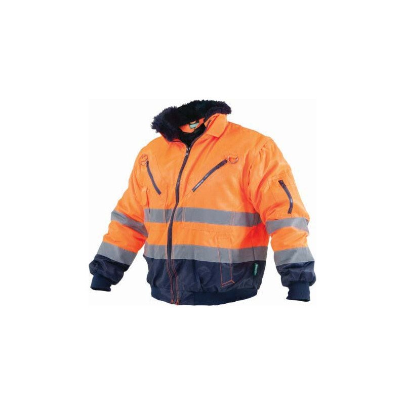 Multifunkčná zateplená pilotná bunda STALCO, model Pilot Hi-Vis 3v1, v oranžovej farbe. Vysoko viditeľný odev navrhnutý pre prácu v chladných a nepriaznivých podmienkach. Systém 3v1 umožňuje nosiť ju ako kompletnú zimnú bundu, prechodnú bundu alebo ako zateplenú vestu vďaka odnímateľnej kožušinovej vložke a odnímateľným rukávom. Odolný vonkajší materiál a početné reflexné pásy zaručujú odolnosť a maximálnu bezpečnosť.