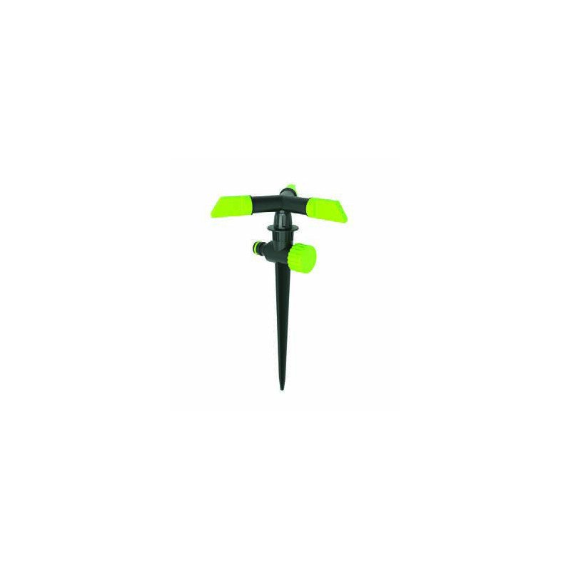 Rovnomerná závlaha v tvare dažďa: Zavlažovač využíva tlak vody na rotáciu troch ramien. Každé rameno má presne nasmerované trysky, ktoré rozprašujú vodu v plnom 360° kruhu. Výsledkom je jemná a rovnomerná závlaha pripomínajúca dážď, ktorá je šetrná k rastlinám aj pôde a zabraňuje tvorbe mlák. V závislosti od tlaku vody dokáže pokryť plochu s priemerom až 15 metrov.