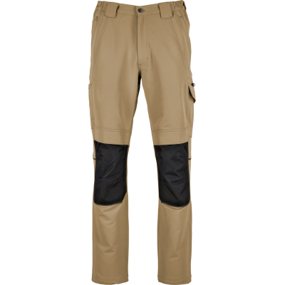 Moderné a extrémne pružné pracovné nohavice STALCO, model STINGER, v tmavej béžovej farbe. Navrhnuté pre dynamickú prácu v teréne aj v dielni, s dôrazom na maximálnu voľnosť pohybu a komfort, najmä v teplejšom počasí. Sú vyrobené z ľahkej a elastickej tkaniny (polyester/elastan). Unikátny systém vetrania na stehnách a elastický pás so šnúrkou zaručujú výnimočné pohodlie. Zosilnené kolená s vreckami na nákolenníky a početné funkčné vrecká na zips zvyšujú ich praktickosť a odolnosť.