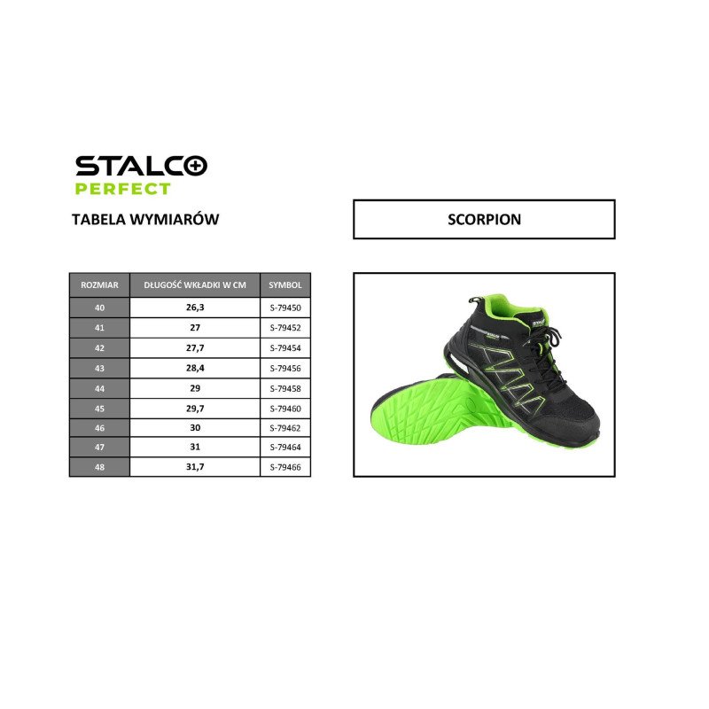 Vysoko technologická a extrémne pohodlná bezpečnostná obuv STALCO PERFECT, model SCORPION. Certifikovaná v najvyššej kategórii S3 SRC s dodatočnou ochranou ESD. Navrhnutá pre profesionálov, ktorí vyžadujú maximálnu ochranu a bezkonkurenčný komfort porovnateľný so špičkovou športovou obuvou. Inovatívna podrážka s tlmiacim materiálom ETPU poskytuje mimoriadne odpruženie. Moderná "Metal Free" konštrukcia s kompozitnou špičkou a kevlarovou stielkou znižuje hmotnosť a zvyšuje komfort.