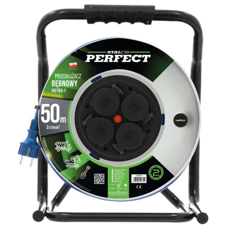 Profesionálny predlžovací kábel na bubne STALCO PERFECT HEAVY LINE, dĺžka 40 m. Navrhnutý pre najnáročnejšie použitie na stavbách a v priemysle. Vybavený hrubým (3x2,5 mm²) a extrémne odolným gumovým káblom H05RR-F, ktorý zostáva pružný aj v chlade. Štyri zásuvky s ochrannými viečkami zaručujú stupeň krytia IP44 (ochrana proti striekajúcej vode). Integrovaná tepelná poistka chráni pred preťažením. Nekompromisné riešenie pre profesionálov, ktorí vyžadujú maximálnu bezpečnosť a spoľahlivosť.