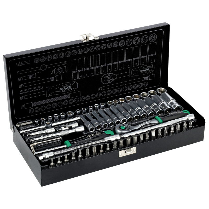 Sada nástrčných kľúčov, kovová škatuľa, 67 prvkov 1/4˝ račňa 90 zubov - STALCO