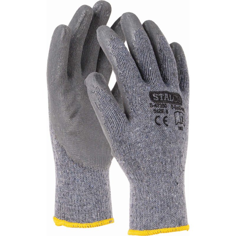 Ekonomické a všestranné pracovné rukavice STALCO, model S-ECO DRAG, veľkosť 9. Navrhnuté na bežné práce v stavebníctve, dielni a záhrade, kde je potrebná dobrá priľnavosť a cit v prstoch. Jemnejší bavlnený úplet (hrúbka 10g) poskytuje lepší cit a pohodlie. Dlaň a prsty sú potiahnuté vrstvou štruktúrovaného latexu pre istý úchop a odolnosť voči oderu.