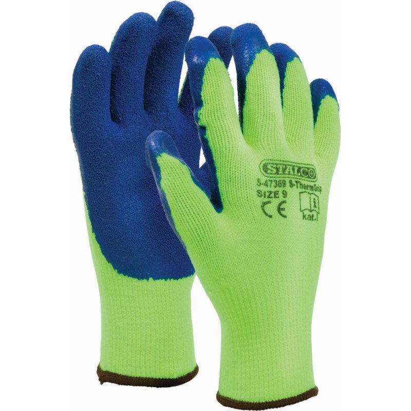 Zateplené pracovné rukavice STALCO, model S-Therm Grip, veľkosť 10. Navrhnuté pre prácu v chladných a zimných podmienkach. Poskytujú vynikajúcu tepelnú izoláciu a istý úchop. Hrejivý akrylátový úplet (hrúbka 10g) s mäkkou vnútornou stranou udržuje ruky v teple. Dlaň a prsty sú potiahnuté štruktúrovaným latexom pre skvelú priľnavosť a odolnosť voči oderu.