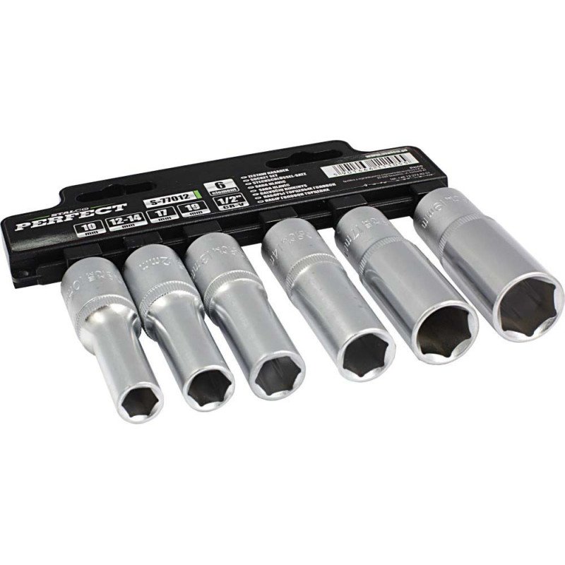 Profesionálna 6-dielna sada predĺžených nástrčných hlavíc STALCO PERFECT s unášačom 1/2". Navrhnutá na prístup k hlboko uloženým skrutkám a maticiam na dlhých závitových tyčiach. Pokrýva najbežnejšie veľkosti v rozsahu 10-19 mm. Hlavice sú vykované z vysoko pevnej chróm-vanádiovej (Cr-V) ocele a ich špeciálny profil chráni hrany skrutiek. Dodávané na praktickej úložnej lište. Nevyhnutné rozšírenie každej 1/2" gola sady.