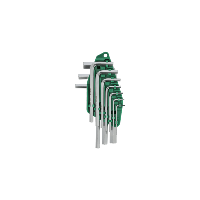 Profesionálna 10-dielna sada krátkych šesťhranných (imbusových) kľúčov STALCO. Základná sada pre uťahovanie a povoľovanie skrutiek s vnútorným šesťhranom. Nevyhnutná výbava pre každú dielňu, servis a montážnu tašku. Kľúče sú vyrobené z vysoko pevnej chróm-vanádiovej (Cr-V) ocele pre dlhú životnosť a odolnosť voči skrúteniu. Sada obsahuje 10 najbežnejších metrických veľkostí (1.5 - 10 mm) v praktickom sklopnom držiaku.