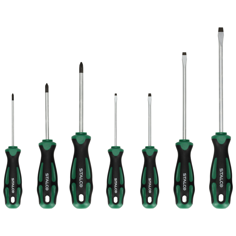 Praktická 7-dielna sada skrutkovačov STALCO. Rozšírená univerzálna sada obsahujúca najpoužívanejšie ploché (SL) a krížové (PH) skrutkovače. Ideálna pre dielňu, domácnosť a montážne práce. Drieky sú vyrobené z vysokokvalitnej chróm-vanádiovej ocele (Cr-V) a majú magnetické hroty pre jednoduchšiu prácu. Ergonomická dvojkomponentná rukoväť zaručuje pohodlný a pevný úchop.