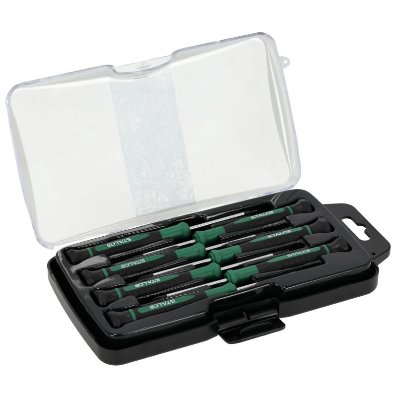 Profesionálna 7-dielna sada skrutkovačov STALCO pre jemnú mechaniku. Navrhnutá pre presné a detailné práce v elektrotechnike, modelárstve a pri opravách malých zariadení. Drieky sú vyrobené z kvalitnej Cr-V ocele s presne opracovanými, magnetickými hrotmi. Rukoväte s otočnou hlavicou umožňujú rýchlu a precíznu prácu jednou rukou. Sada obsahuje 7 najbežnejších veľkostí pre jemnú prácu, dodávaných v praktickom plastovom puzdre.