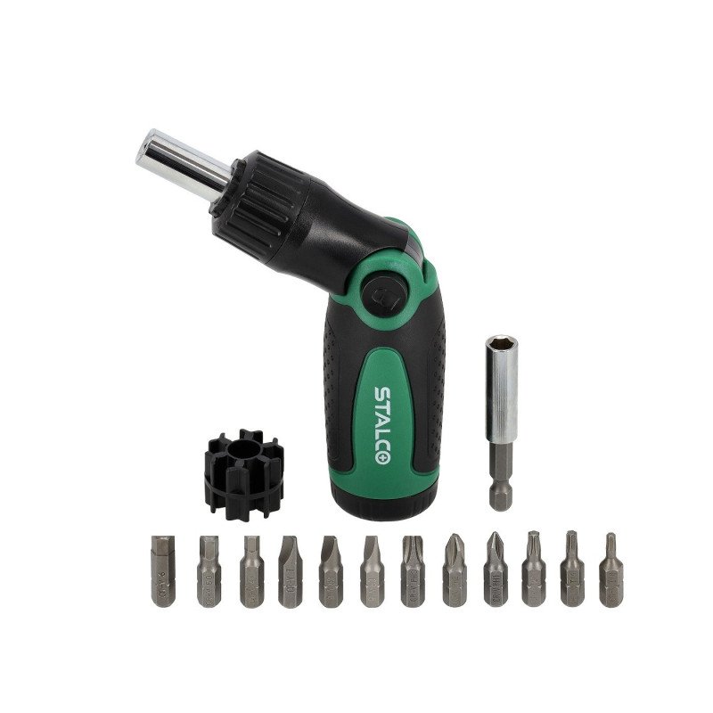 Univerzálny račňový skrutkovač STALCO so sadou 12 najpoužívanejších bitov. Navrhnutý na zrýchlenie a zjednodušenie všetkých bežných skrutkovacích prác. Odolný račňový mechanizmus s 3 polohami (vpravo/vľavo/pevný) umožňuje prácu bez prechytávania rukoväte. Veľkou výhodou je úložisko bitov priamo v rukoväti. Ergonomická rukoväť a magnetický držiak zaručujú pohodlnú a efektívnu prácu.