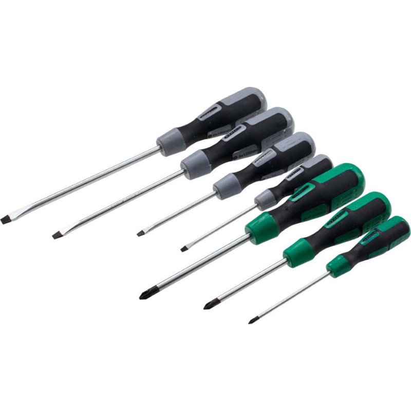 Základná 7-dielna sada skrutkovačov STALCO pre profesionálne použitie v dielni aj na montáži. Každý skrutkovač disponuje odolným hrotom z chróm-vanádiovej ocele a praktickou magnetickou špičkou. Ergonomické rukoväte poskytujú komfort a umožňujú vyvinúť vysoký krútiaci moment. Kompletná sada pre najčastejšie používané ploché a krížové skrutky.