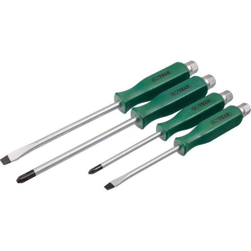 Sada 4 kusov extra odolných zámočníckych skrutkovačov STALCO, navrhnutých pre najnáročnejšie práce, povoľovanie zaseknutých skrutiek a aplikáciu vysokej sily. Priechodný hrot umožňuje údery kladivom a šesťhranný nástavec na kľúč poskytuje extrémny krútiaci moment. Silne magnetické hroty sú vyrobené z prémiovej chróm-vanádiovej ocele.