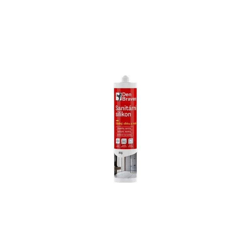 Špeciálny sanitárny acetátový silikónový tmel DEN BRAVEN v bielej farbe, balenie 280 ml. Navrhnutý na tesnenie škár v priestoroch s trvalo vysokou vlhkosťou, ako sú kúpeľne, kuchyne, toalety a práčovne. Biela farba je klasickou voľbou pre dokonalý a čistý finiš. Tmel obsahuje účinné fungicídne zložky, ktoré zaručujú dlhodobú odolnosť proti plesniam. Vytvára trvalo pružný a 100% vodotesný spoj.