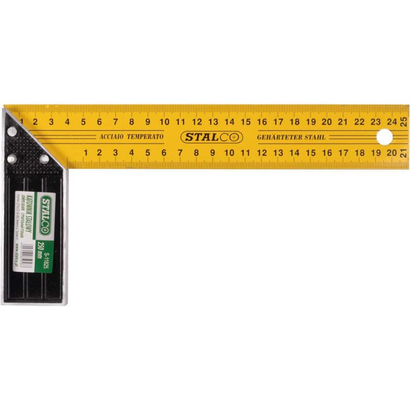 Univerzálny stolársky uholník STALCO s oceľovým pravítkom 250 mm na presné meranie a značenie 90° a 45° uhlov. Pevná konštrukcia a jasne čitateľná stupnica z neho robia spoľahlivého pomocníka. Základný nástroj do každej dielne pre tesárov, stolárov a domácich majstrov,
