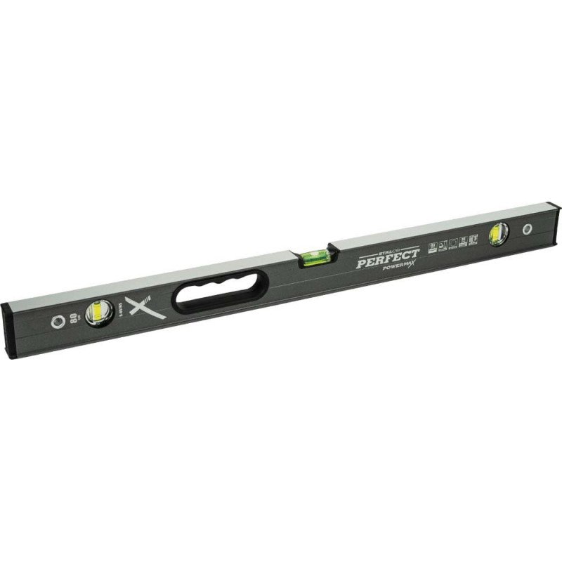 hliníkové telo z H-profilu zvyšujúce tuhosť opatrené práškovou farbou odolnou voči oderu 3 libelky zväčšená horizontálna libelka pre uľahčenie odčítania z každej strany presnosť merania 0,5 mm / 1 m obojstranne frézovaný profil ergonomické rukoväte plastové zátky absorbujúce nárazy s jednostrannými výčnelkami pre stabilizovanie horizontálnej polohy na rovnom povrchu