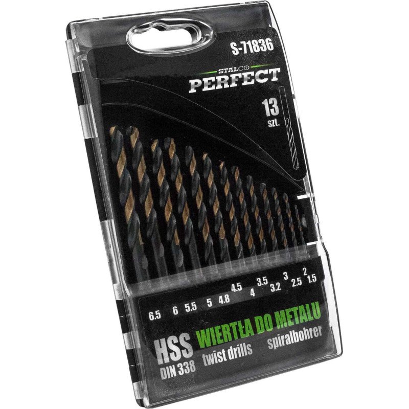 Profesionálna 13-dielna sada HSS vrtákov do kovu STALCO PERFECT. Navrhnutá pre vysoko presné a efektívne vŕtanie do ocele, liatiny a neželezných kovov. Vrchol brúsený pod uhlom 135° so samostrediacou špičkou (split point) umožňuje vŕtanie bez predchádzajúceho bodkovania. Vrtáky sú vyrobené z rýchloreznej ocele HSS podľa normy DIN 338, s precízne brúsenou špirálou a špeciálnym povlakom na zníženie trenia. Kompletná sada priemerov (1,5 - 6,5 mm) v odolnom plastovom puzdre.