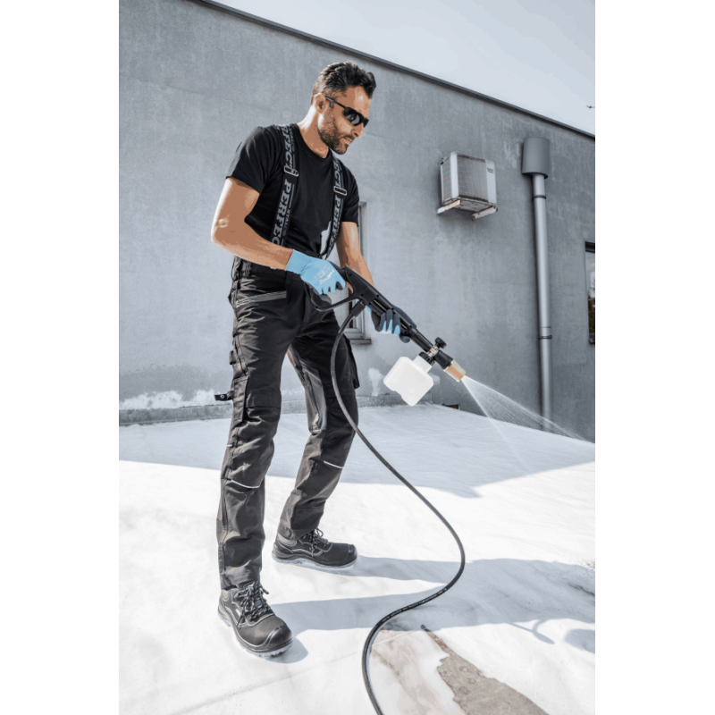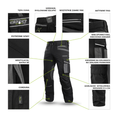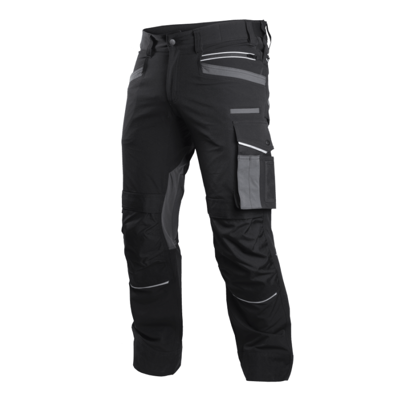 Vysoko funkčné a elastické pracovné nohavice STALCO PERFECT z prémiovej rady STRETCH LINE. Navrhnuté pre profesionálov, ktorí vyžadujú maximálnu voľnosť pohybu, odolnosť a celodenný komfort. Sú vyrobené z modernej elastickej tkaniny so softshellovými vlastnosťami a majú zosilnenia z materiálu CORDURA®. Spoľahlivé zipsy YKK® a reflexné prvky 3M™ Scotchlite™ potvrdzujú ich špičkovú kvalitu. Početné multifunkčné vrecká, vrecká na nákolenníky a elastický pás zaručujú maximálnu praktickosť.