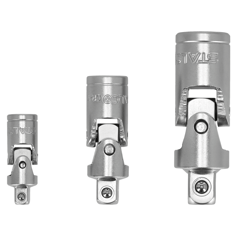 Profesionálna 3-dielna sada kardanových kĺbov STALCO. Nevyhnutné príslušenstvo pre každú gola sadu, ktoré umožňuje prístup k skrutkám a maticiam pod uhlom. Sada obsahuje kĺby pre všetky tri najbežnejšie veľkosti unášačov: 1/4", 3/8" a 1/2". Sú vyrobené z vysoko pevnej chróm-vanádiovej (Cr-V) ocele pre maximálnu odolnosť. Guľôčková poistka zaisťuje bezpečné uchytenie hlavice.