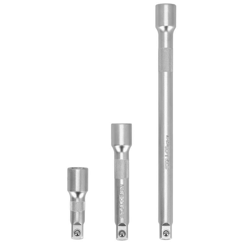 Profesionálna 3-dielna sada predlžovacích nadstavcov STALCO s unášačom 1/2". Základná sada na predĺženie dosahu 1/2" račne alebo kľúča, ktorá umožňuje prístup k hlboko uloženým alebo zle prístupným skrutkám a maticiam. Sada obsahuje 3 najpoužívanejšie dĺžky: 50 mm, 125 mm a 250 mm. Všetky diely sú vyrobené z vysoko pevnej chróm-vanádiovej (Cr-V) ocele pre maximálnu odolnosť.