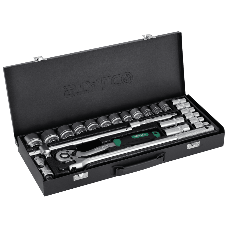 Profesionálna 25-dielna gola sada STALCO v odolnom kovovom kufríku. Univerzálna sada s unášačom 1/2", navrhnutá pre širokú škálu prác v autoopravárenstve, údržbe a priemysle. Obsahuje 1/2" račňu s jemným chodom, širokú paletu nástrčných hlavíc (napr. 10-32 mm) a kompletné príslušenstvo (predĺženia, vratidlo, kĺb). Všetky komponenty sú vyrobené z vysoko pevnej Cr-V ocele. Ideálna základná výbava pre každú profesionálnu dielňu.