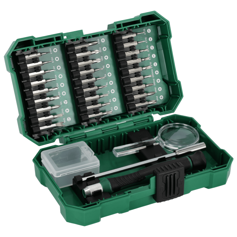 Kompletná sada bitov: Obsahuje 27 kusov presných 4 mm bitov, vyrobených z odolnej chróm-vanádiovej ocele (Cr-V). Sada pokrýva širokú škálu typov a veľkostí potrebných pre modernú elektroniku: