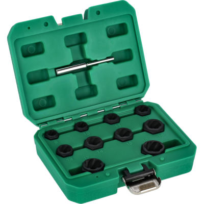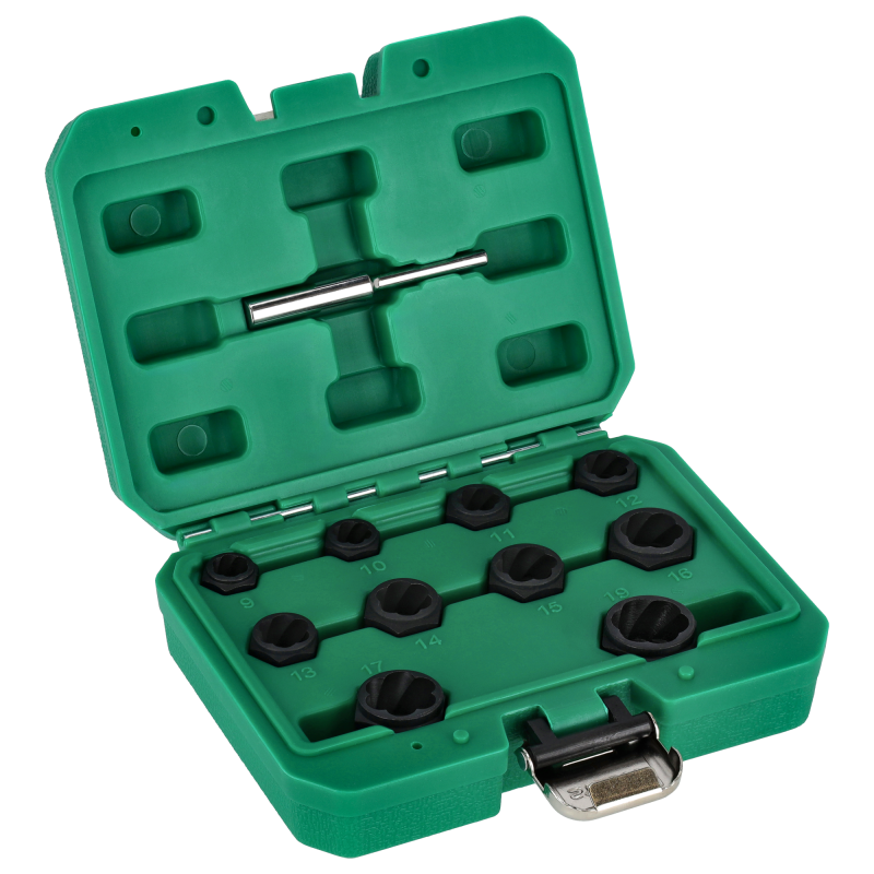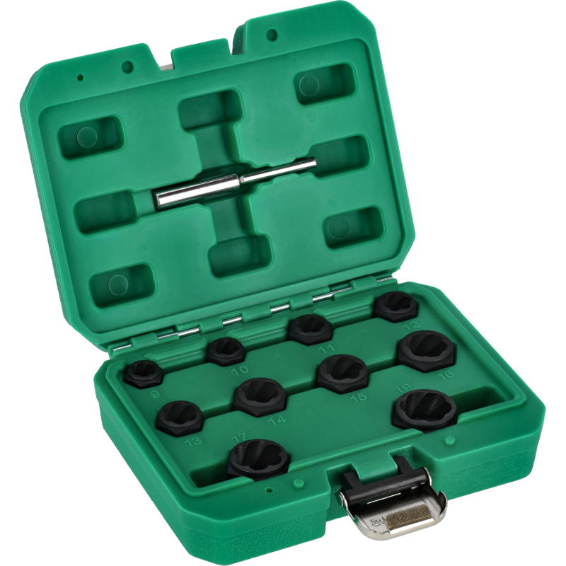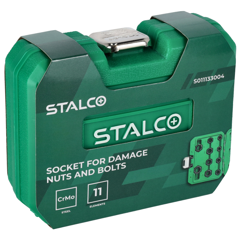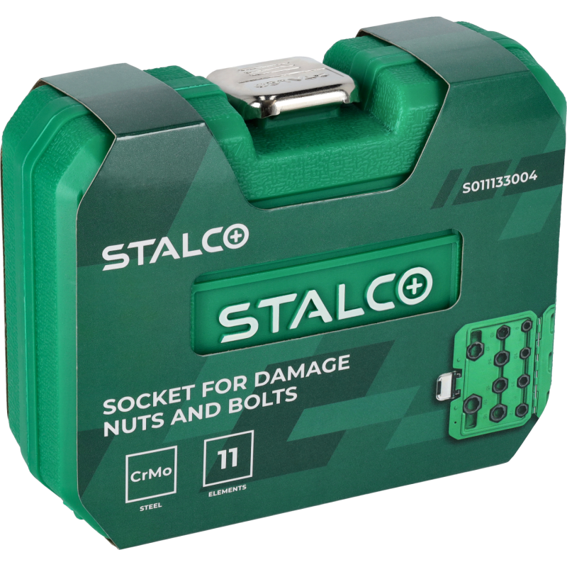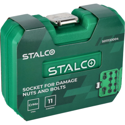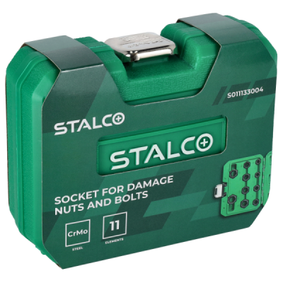 Profesionálna 11-dielna sada STALCO na vyťahovanie poškodených skrutiek a matíc. Špeciálna sada navrhnutá na jednoduché a rýchle odstránenie skrutiek a matíc so strhnutými, zaoblenými alebo inak poškodenými hranami. Hlavice majú špeciálny kónický špirálový profil, ktorý sa bezpečne zahryzne do poškodenej hlavy a umožní jej povolenie. Sú vyrobené z odolnej Cr-Mo ocele. Sada obsahuje 10 hlavíc v najbežnejších veľkostiach a vyrážací tŕň.