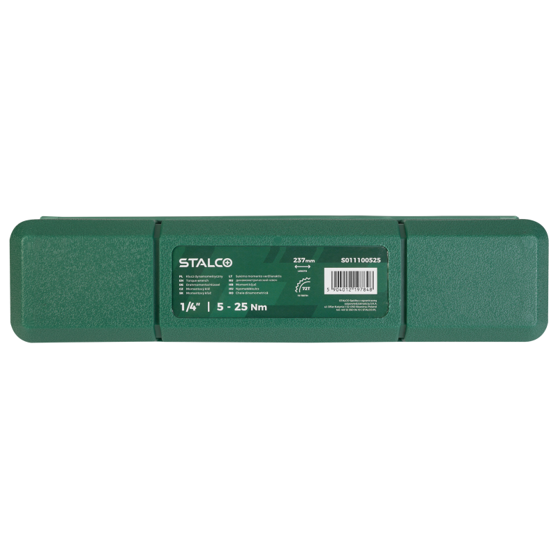 Profesionálny momentový kľúč STALCO s unášačom 1/4" a presným rozsahom 5-25 Nm. Navrhnutý na presné uťahovanie skrutkových spojov na vopred definovaný krútiaci moment. Nevyhnutný nástroj pre prácu na bicykloch, motocykloch, komponentoch motorov a v jemnej mechanike. Spoľahlivý "klikací" mechanizmus presne signalizuje dosiahnutie nastaveného momentu. Jemná 72-zubová račňová hlava z Cr-Mo ocele umožňuje prácu v stiesnených priestoroch.