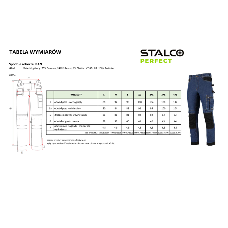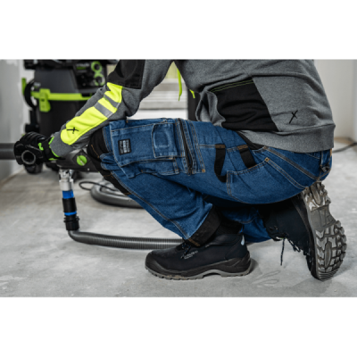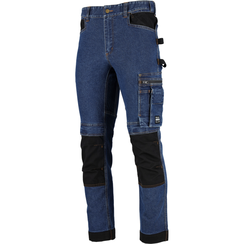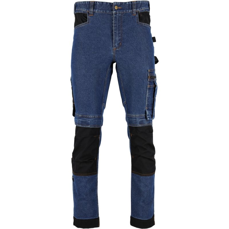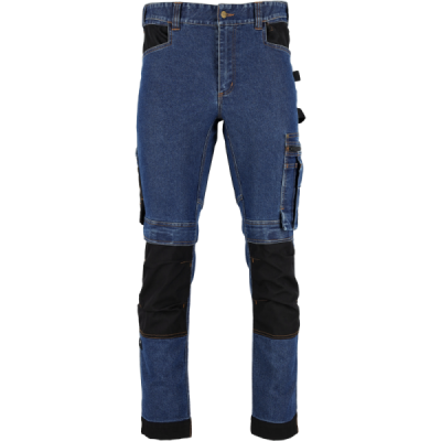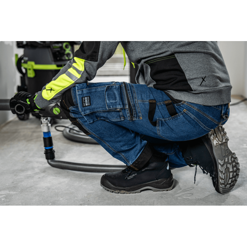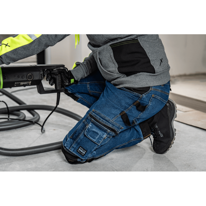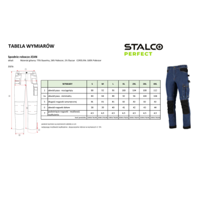 Profesionálne a štýlové pracovné džínsy STALCO PERFECT z rady JEAN. Navrhnuté pre remeselníkov, ktorí vyžadujú odolnosť a funkčnosť pracovných nohavíc v klasickom civilnom vzhľade. Pružná džínsovina (zmes bavlny, polyesteru a elastanu) zaručuje maximálny komfort. Zosilnenie z materiálu CORDURA® na kolenách a lemoch, spoľahlivé zipsy YKK® a reflexné prvky 3M™ Scotchlite™ potvrdzujú ich prémiový charakter. Disponujú početnými multifunkčnými vreckami, vreckami na nákolenníky a elastickým pásom STRETCH BELT.