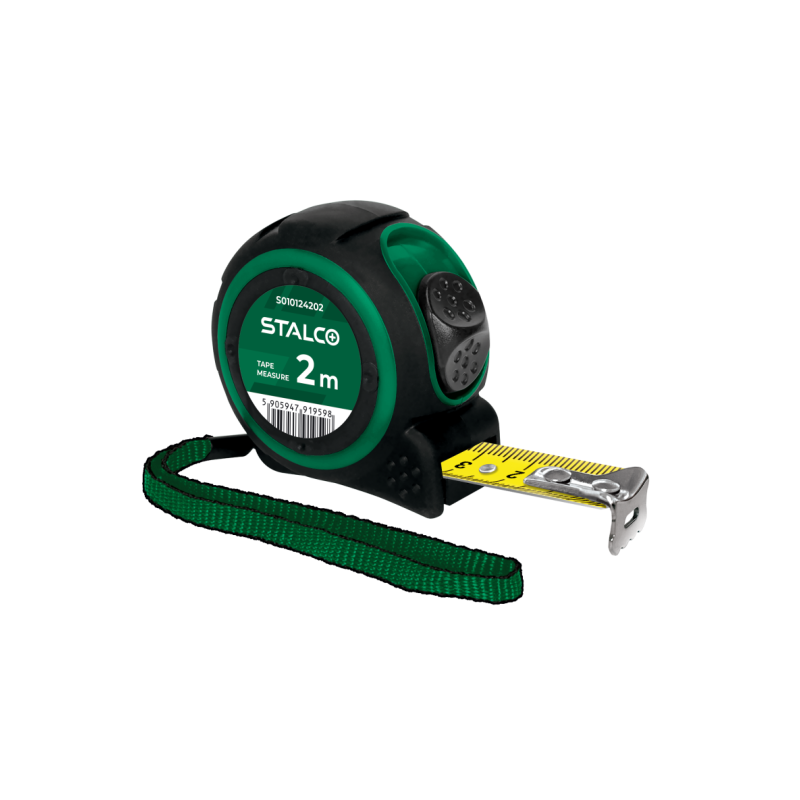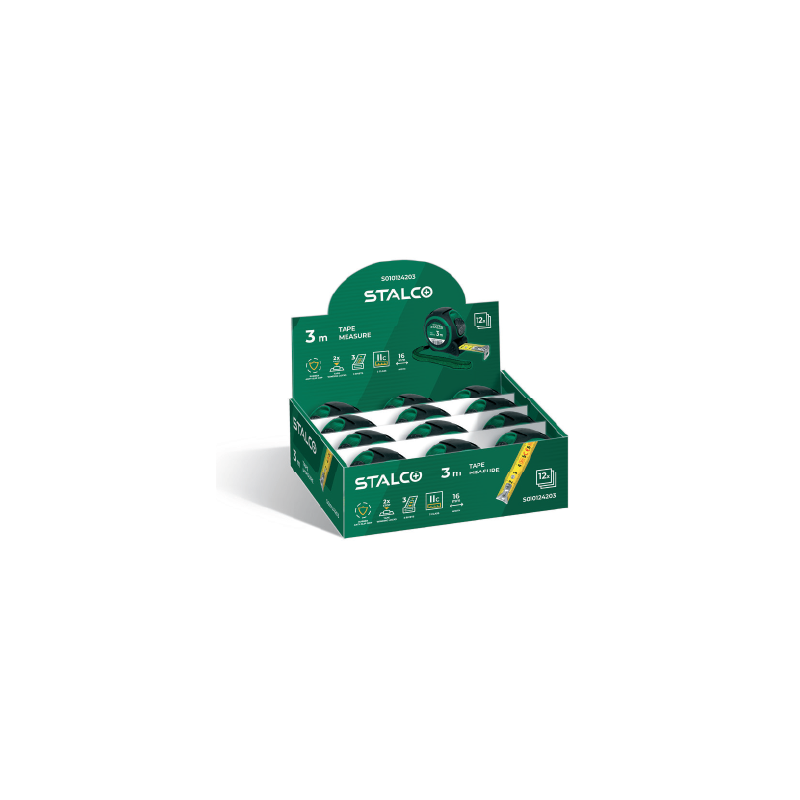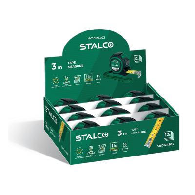 Meter zvinovací STALCO – odolný protišmykový kryt, presnosť triedy II, oceľová páska s hrúbkou 0,135 – 0,145 mm, pružina z mangánovej ocele, balené vo farebnom kartónovom stojane.