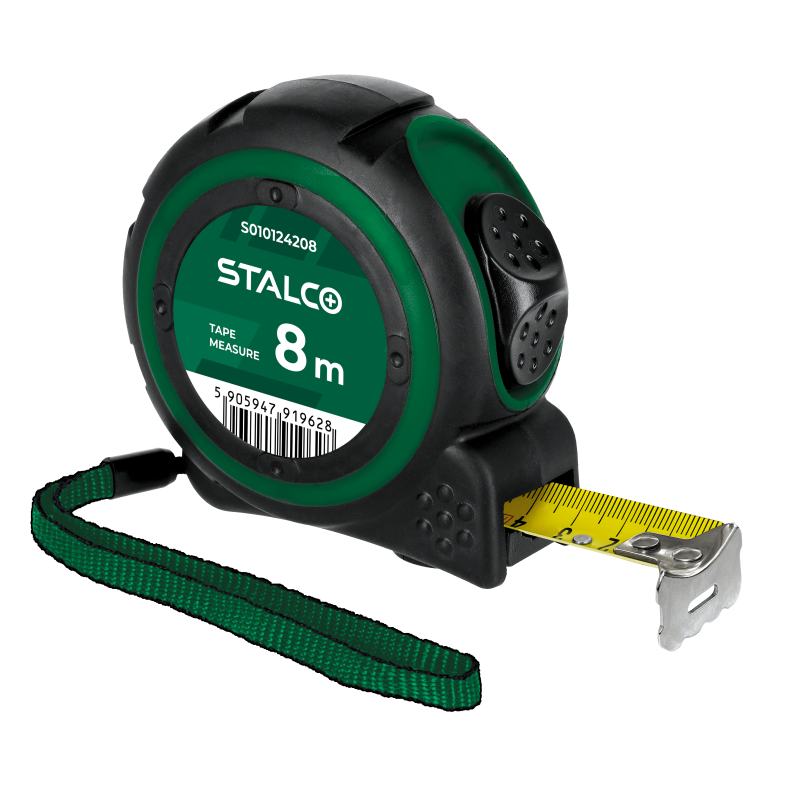 Meter zvinovací STALCO – odolný protišmykový kryt, presnosť triedy II, oceľová páska s hrúbkou 0,135 – 0,145 mm, pružina z mangánovej ocele, balené vo farebnom kartónovom stojane.