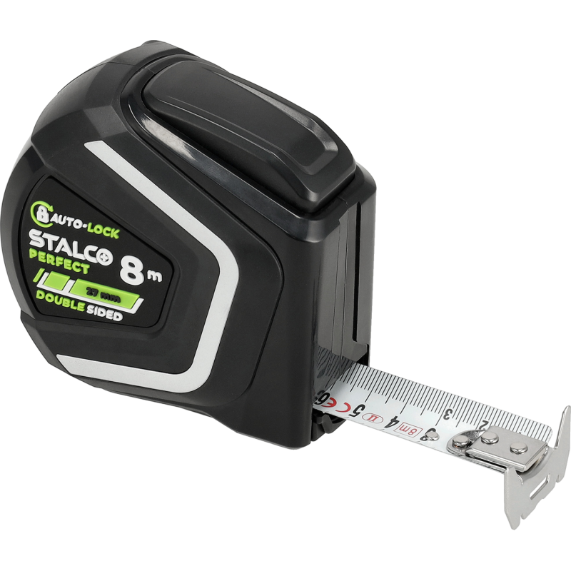 Profesionálny a kompaktný zvinovací meter STALCO PERFECT s funkciou AUTOSTOP, s dĺžkou 8 m a šírkou pásky 27 mm. Navrhnutý na rýchle a pohodlné meranie v dielni, na stavbe aj v domácnosti. Mechanizmus AUTOSTOP automaticky zabrzdí pásku pri jej vytiahnutí, čo umožňuje jednoduché ovládanie jednou rukou. Páska sa zvinie až po stlačení uvoľňovacieho tlačidla. Odolná, 27 mm široká páska s nylonovým povlakom má certifikovanú presnosť MID triedy II.